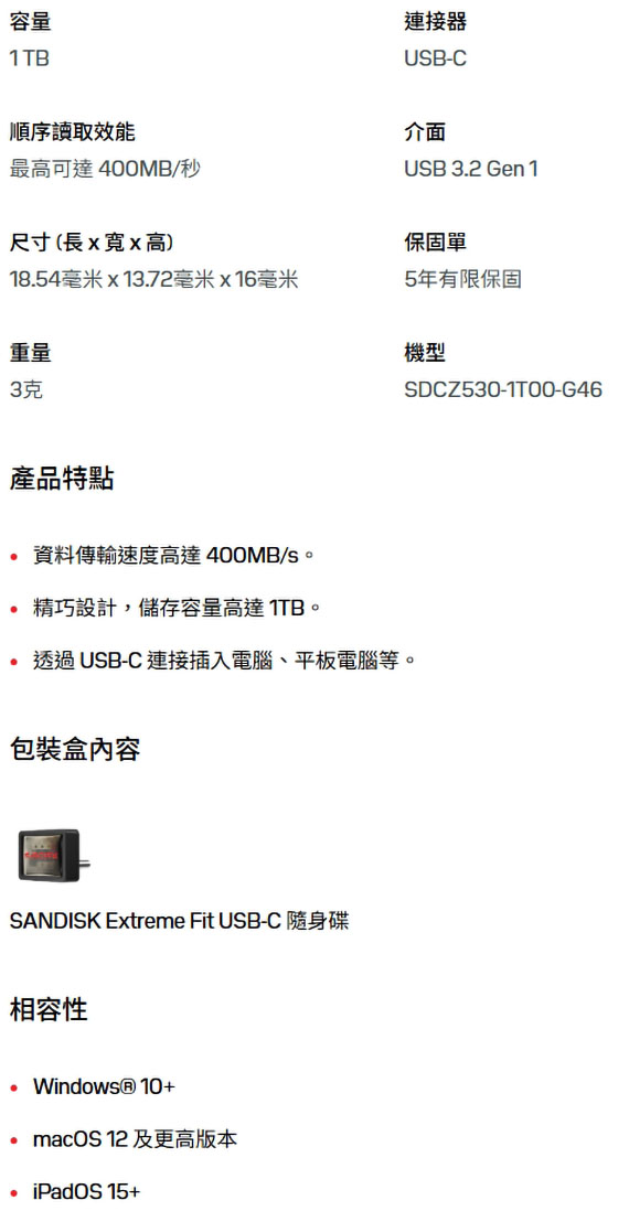 USB-C連接,USB 3.2 Gen 1介面,讀取高達400MB/秒,尺寸(長*寬*高)18.54*13.72*16mm,3克重,從未有過的輕巧體驗,SANDISK應用程式,5年有限保固,SDCZ530-1T00-G46