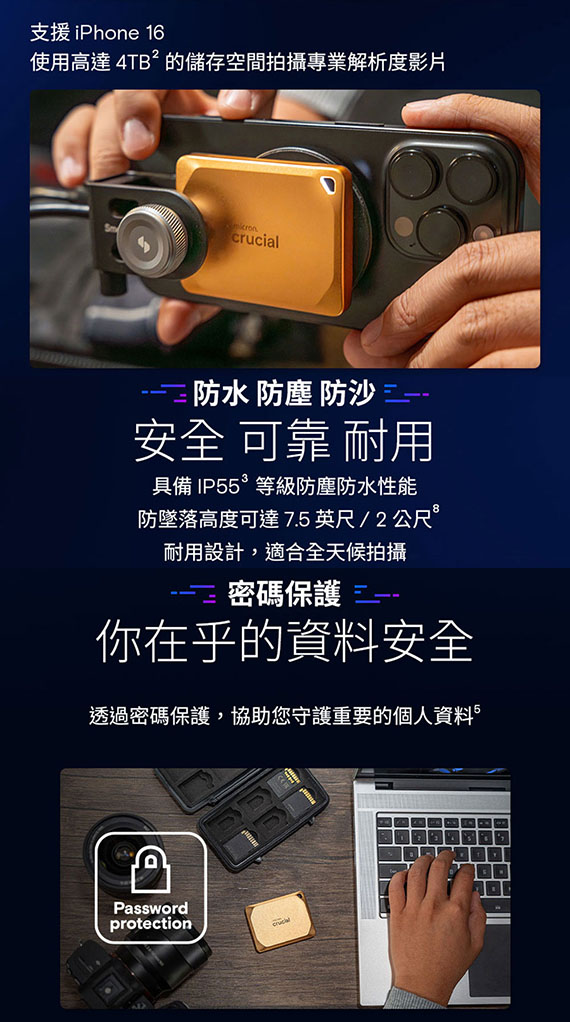 USB3.2 Gen2 2x2(20Gb/s)介面,USB-C接頭,讀取/寫入速度高達 2100/2000 MB/s,採用密碼保護以及256位元AES硬體加密, 防水、防塵、防沙 (IP55),採用陽極氧化鋁搭配柔軟觸感的橡膠底座,內建吊繩孔並提供磁碟活動指示燈,五年有限保
