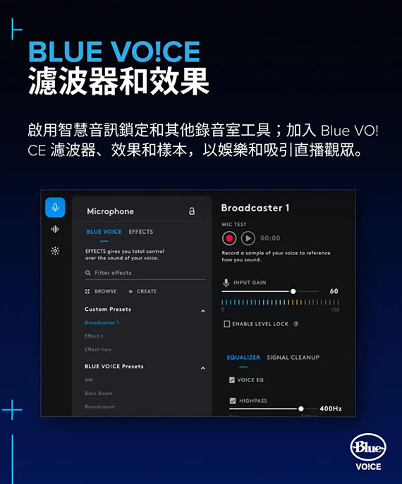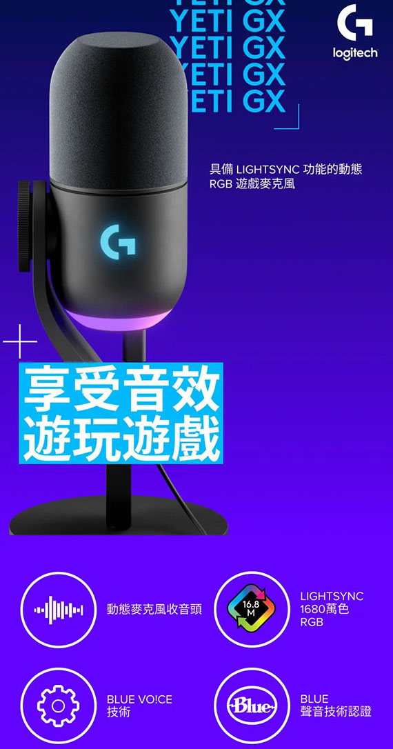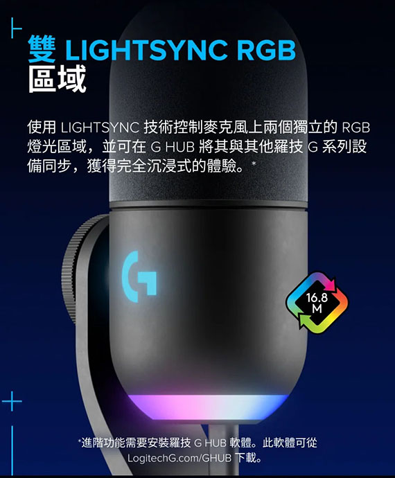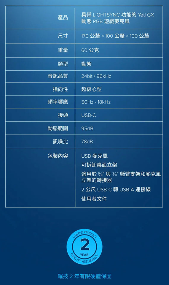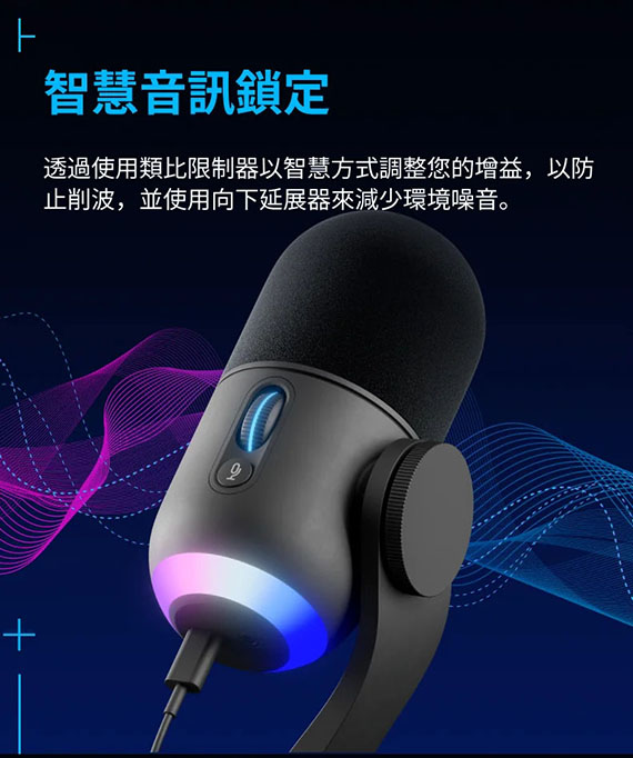 USB,USB-C轉USB-A連接線2公尺,超級心形收音模式,採用LIGHTSYNC技術專為遊戲直播者設計的優質RGB遊戲麥克風,自訂2個獨立RGB區域,結合了特製動態受音頭與先進軟體可拒絕噪音和按鍵聲改善您的聲音並確保在您進行直播時提供一致的高品質音訊,Blue VO!CE軟體可防止削波,類比限制器可調整增益以防止削波, 隨附可拆卸桌面立架或任何懸臂支架(隨附必要的轉接器),2年保固,(988-000578)