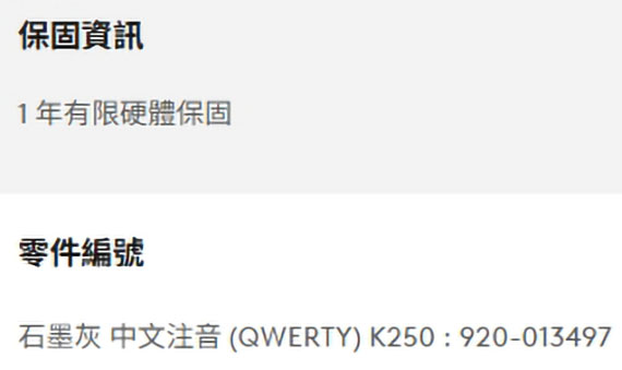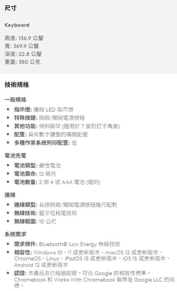 本產品為藍牙無線鍵盤,未附usb無線接收器,若使用桌機需自備藍牙接收器進行配對,深凹式按鍵,連線LED指示燈,開啟關閉電源按鈕,傾斜腳架(適用於7度的打字角度),有數字鍵盤,連線:長按開啟/關閉電源按鈕進行配對,無線技術: 藍牙低耗電技術,電池數量:4號AAA電池*2,920-013497,1年保固 NCC認證碼: CCAI25LP0150T1 BSMI認證碼: R41126