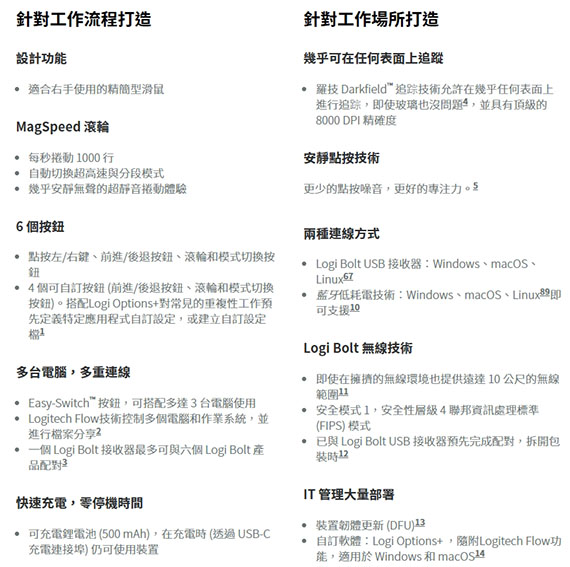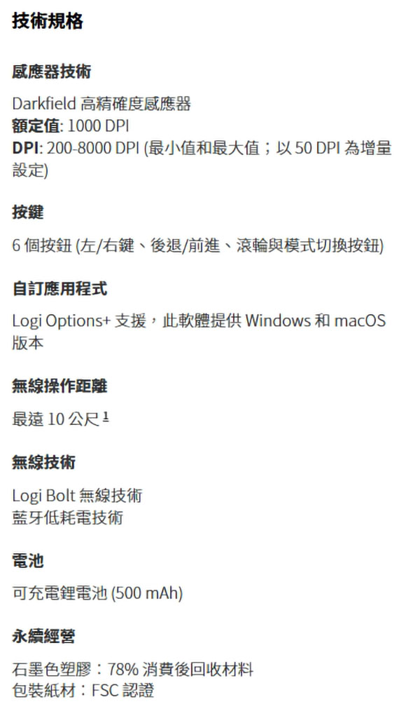 藍牙,Logi Bolt 無線技術,Darkfield 高精確度感應器,DPI: 200-8000 DPI(以50DPI為增量設定),6個按鈕,次充電可提供最長達70天的使用電力,2年有限保固(910-006962)