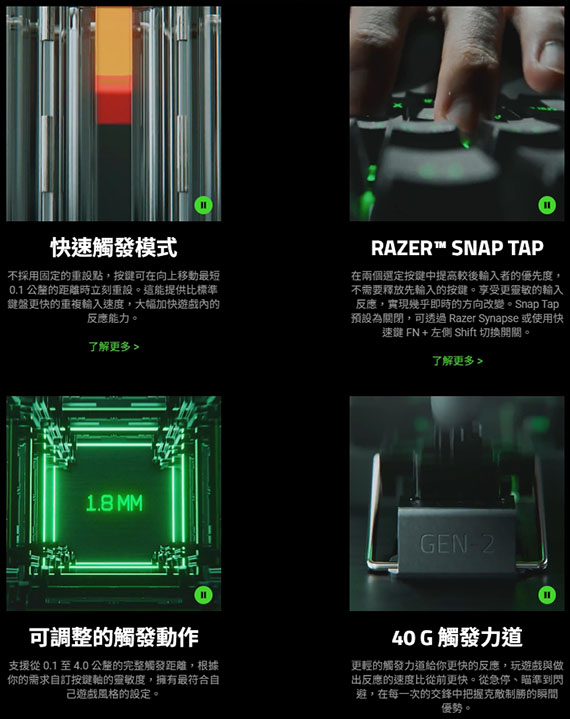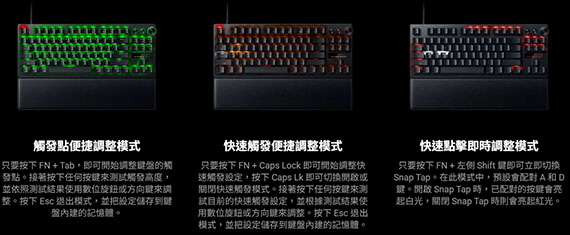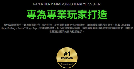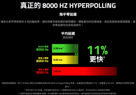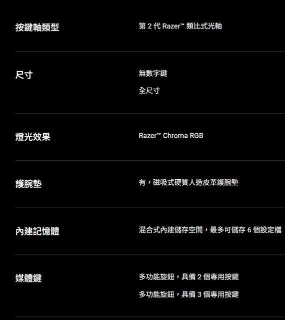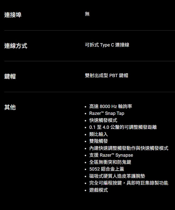 有線/可拆式Type-C連接線,第2代Razer類比式光軸,無數字鍵,紋理表面的雙射出成型PBT鍵帽,多功能數位旋鈕及專用控制按鈕,厚實的吸音泡綿與經過潤滑的按鍵軸,內建便捷調整模式,快速觸發,40G觸發力道,真正的8000 HZ HYPERPOLLING,保固2年