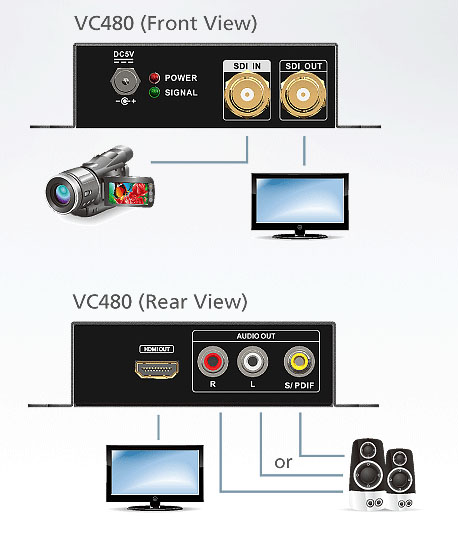 VC480 3G/HD/SD-SDI 轉HDMI影音轉換器提供高解析度訊號即時轉換。SDI訊號轉換成100%的HDMI數位訊號並確保在傳輸過程中不會損耗音訊和視訊訊號。VC480適用於任何監控廣播即時轉換訊號上。