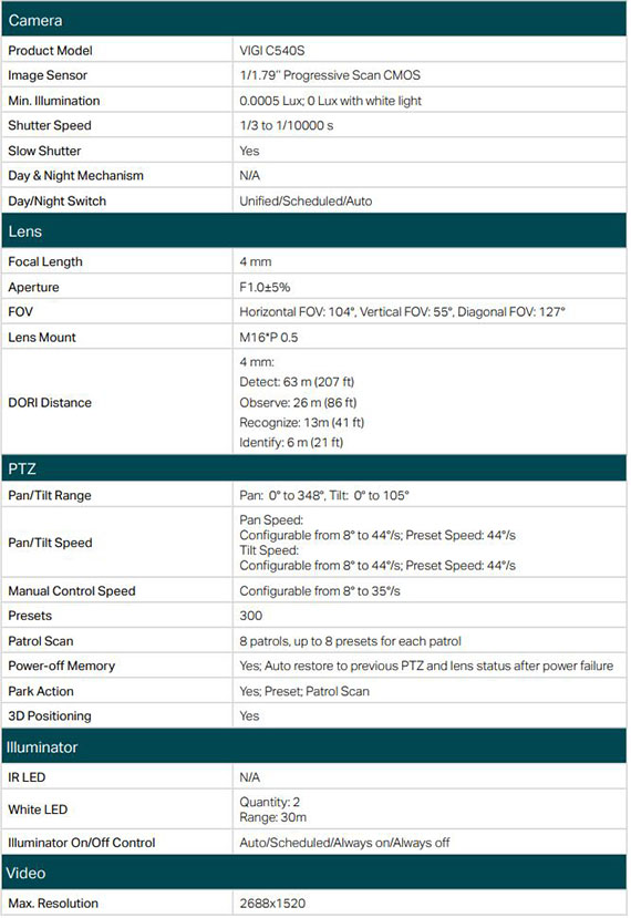解析度2688x1520,1/1.79” 逐行掃描CMOS,4mm定焦鏡頭,水平0°~348°、重直0°~105°,支援micro SD卡最大256GB(另購),超低光彩色夜視,360° 監控,人臉辨識,人&車辨識,智慧偵測,True WDR技術,雙向語音,H.265+智慧影像編碼,IP66防塵防水