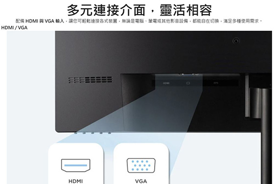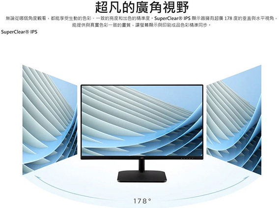 27吋,16:9寬螢幕,IPS面板,解析度1920 x 1080,100Hz刷新率,反應時間1ms,對比1300:1,亮度250cd/m2,輸入介面:1*VGA、1*HDMI、3.5mm耳機孔,支援HDCP,內建喇叭:2*2Watts,VESA壁掛相容,Eye ProTech護眼技術,可變刷新率