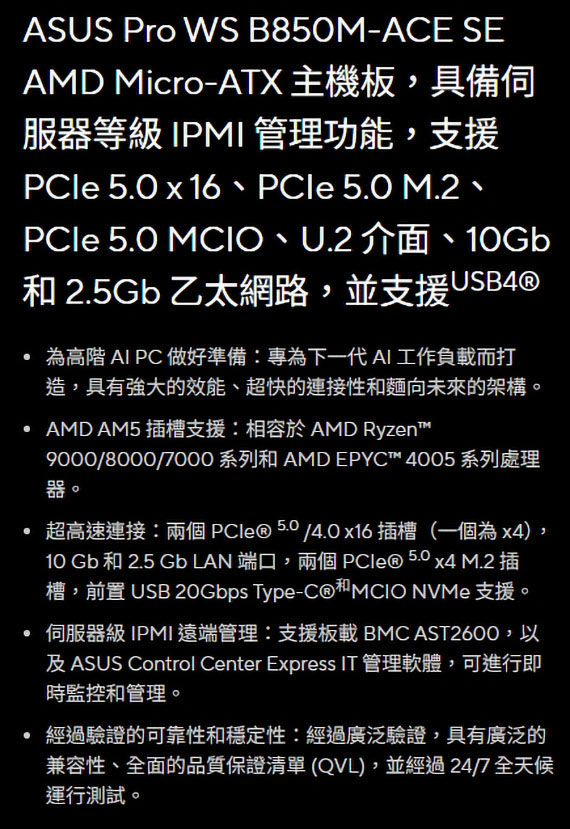 ASUS華碩 PRO WS B850M-ACE SE (m-ATX/DDR5*4/1H1C/Realtek 10G+Intel 2.5Gb/8+2+1相)