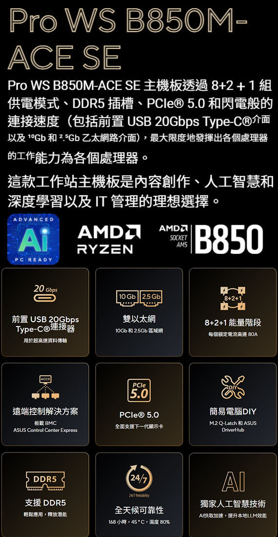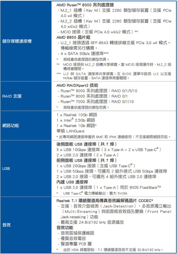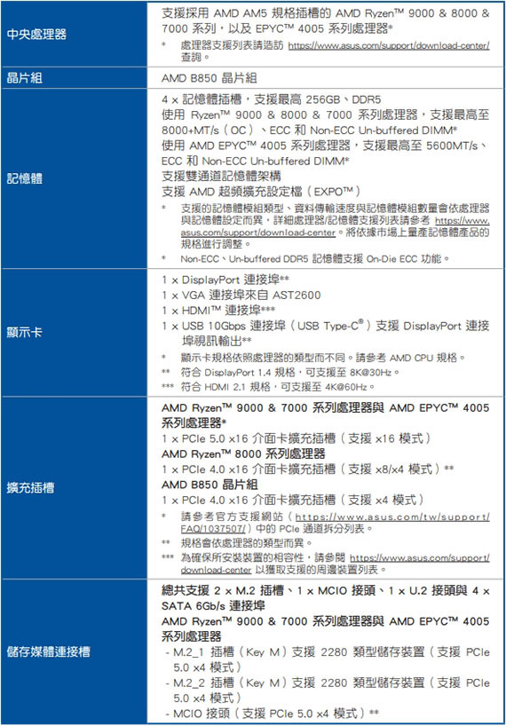 AMD B850,DDR5*4 8000+MT/s (OC),PCIe 5.0x16*1,PCIe 4.0x16*1,2*M.2,4*SATA,Onboard VGA(1*DisplayPort 1.4、1*Type-C port supports DisplayPort output、1*HDMI 2.1、1*VGA) ,Realtek 10G,Type-A*5,USB Type-C*2,需搭配CPU晶片才能使用內顯功能,3年保固