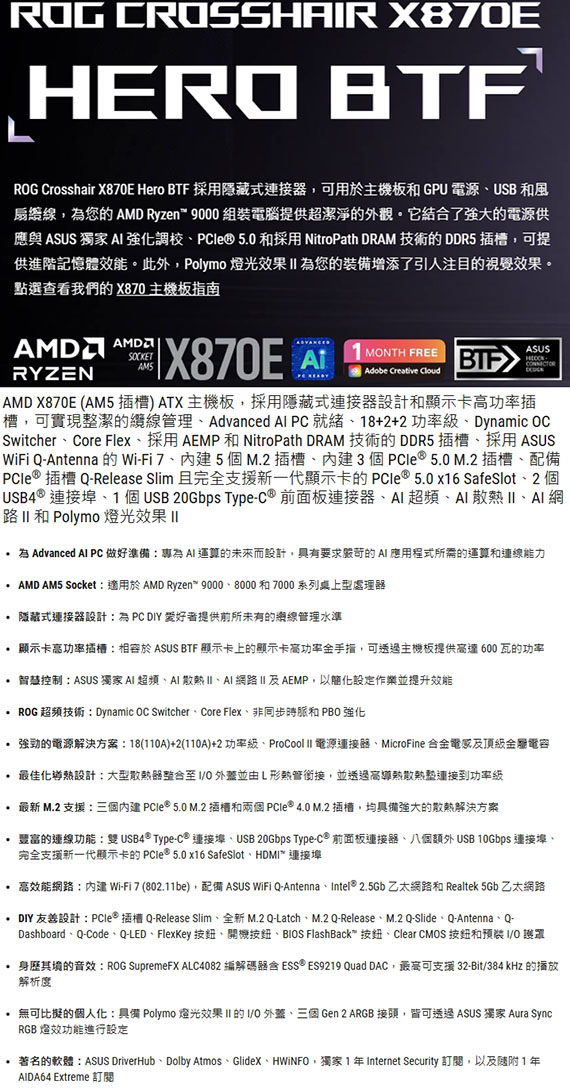 ASUS華碩 ROG CROSSHAIR X870E HERO BTF (ATX/DDR5*4/1H2C/M.2*5/Intel 2.5G+Realtek 5G/WiFi7/18+2+2相)