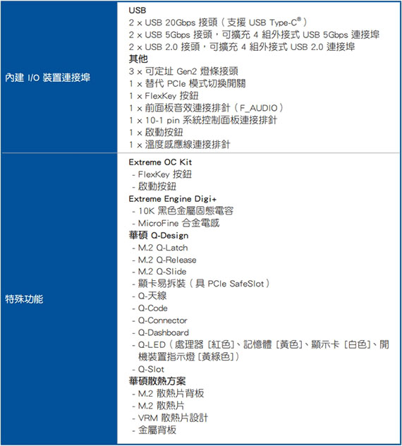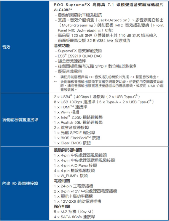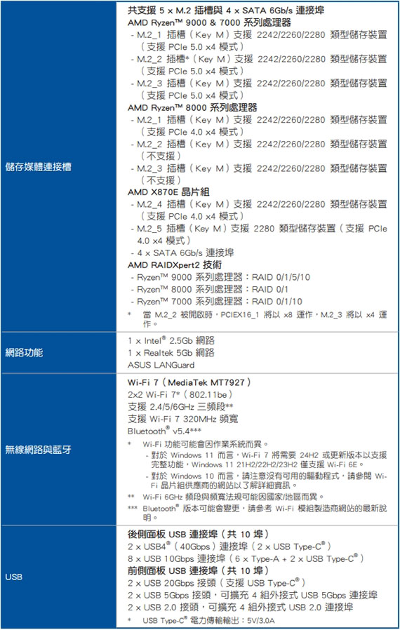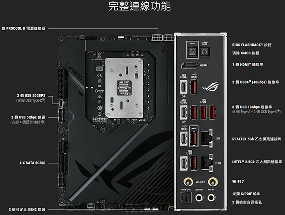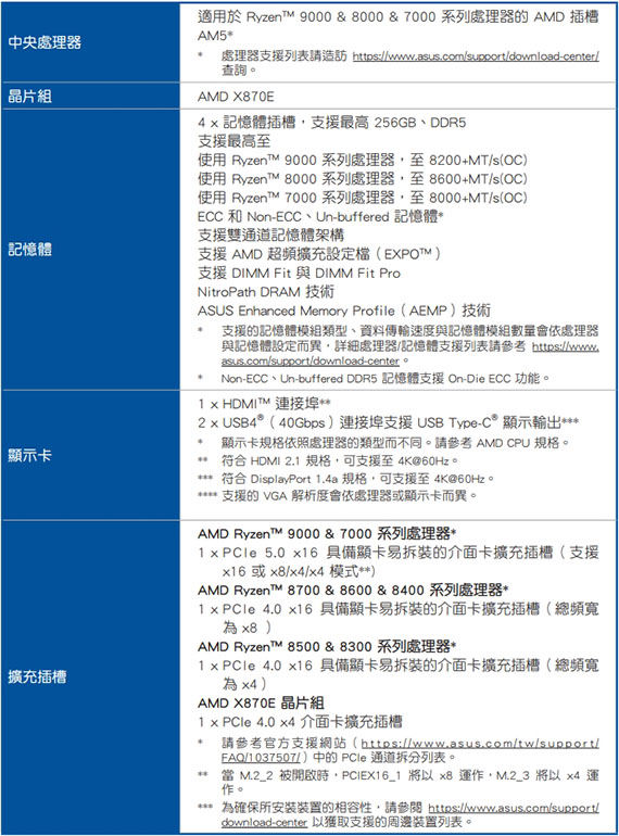 AMD X870E、4*DDR5 8200+(OC)(MAX.256G)、2*PCI-E x16、5*M.2、4*SATA6Gb/s、OnBoard VGA(1*HDMI+2*Type-C)、Intel 2.5Gb+Realtek 5Gb、ROG SupremeFX 7.1CH、WiFi7、藍牙5.4、2*Type-C 10Gbps、6*Type-A 10Gbps、2*鍍金音訊孔、1*光纖S/PDIF、ATX、需搭配CPU晶片才能使用內顯功能、登錄五年保固