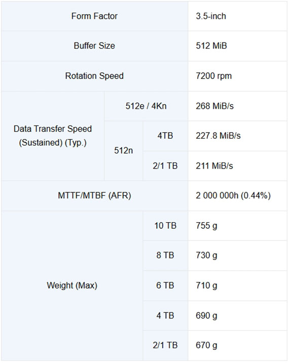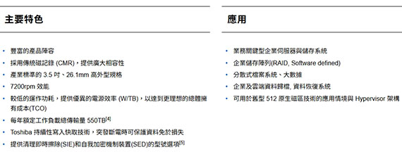 SAS 3.0傳輸介面、轉速:7200RPM、512MB快取記憶體、採用傳統磁記錄(CMR)、3.5吋規格尺寸、五年有限保固