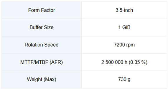 SAS 3.0傳輸介面、轉速:7200RPM、512MB快取記憶體、採用傳統磁記錄(CMR)、3.5吋規格尺寸、五年有限保固