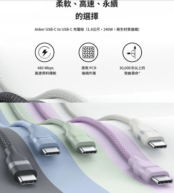 USB、C公<-->C公、線長:1.8公尺(1.8米)/180公分(180cm)、支援240W PD快速充電、傳輸速度480Mbps、柔軟PCR編織外層、通過超過3萬次的彎曲測試