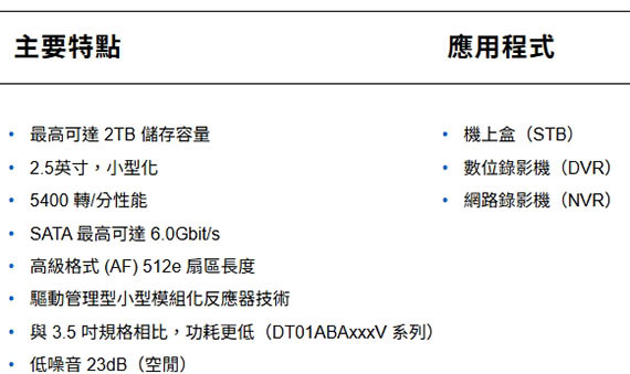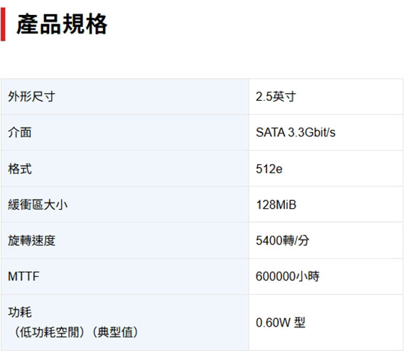 SATA 3.3Gbit/s介面 最高達 6.0Gbit/s,轉速:5400RPM,128MB快取記憶體,2.5英寸,低噪音 23dB,二年有限保固,須保留保固貼紙,做為日後維修保固的憑證