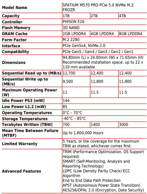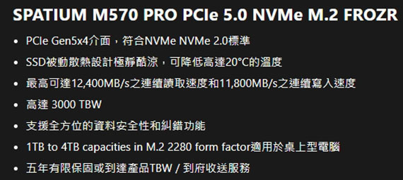 PCIe Gen5 x4介面,符合NVMe NVMe 2.0標準,3D NAND快閃記憶體,讀取速度高達12400MB/s,寫入速度高達11800MB/s, 1400 TBW資料寫入總量, FROZR散熱器專為22x80mm的標準M.2尺寸而設計,FROZR是一款全新的發燒級被動式SPATIUM SSD散熱解決方案,內建資料安全性和糾錯功能,M.2 2280外觀尺寸,五年保固