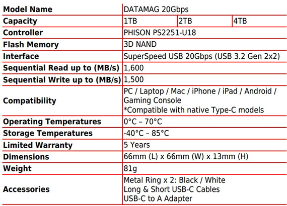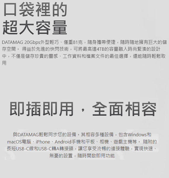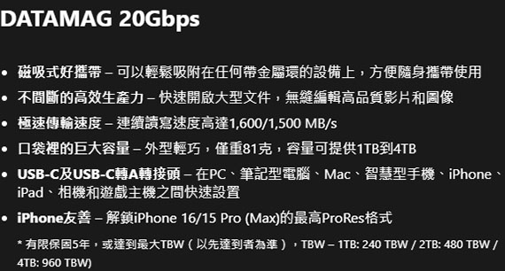Type-C USB3.2 Gen2x2介面、3D NAND快閃記憶體、提供傳輸速率高達1600MB/s、寫入速度高達1500MB/s、採用鋁合金外殼設計、掛還設計、五年保固