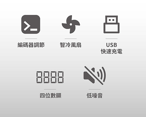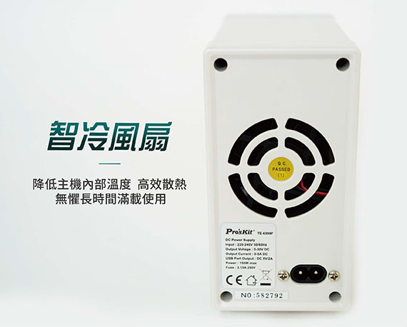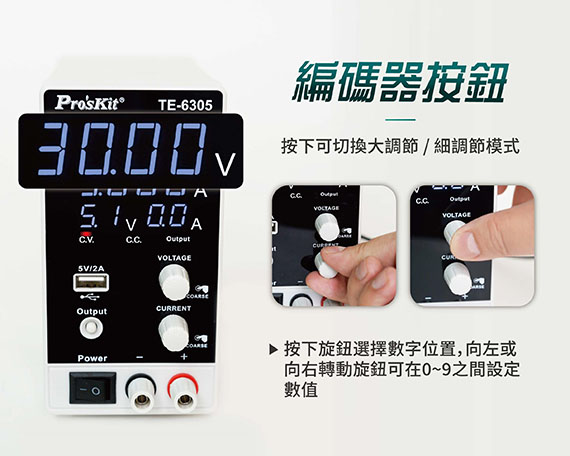 輸入電壓:104~127V/60Hz、恆壓恆流高精度穩定輸出、全功能保護、低波紋低噪音、編碼器調節、四位高清顯示頻、USB充電(5V/2A)
