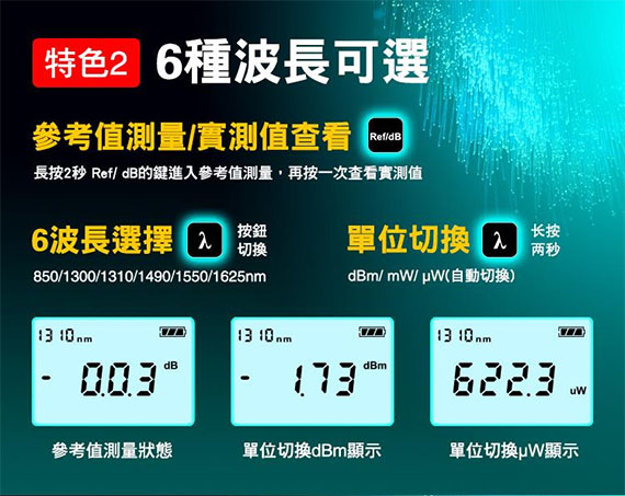 - 可測試六種不同波長的光纖光源損耗,適用於光纜佈線與光路維護之驗收與檢測。