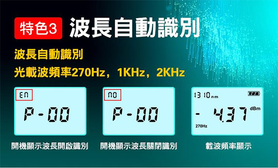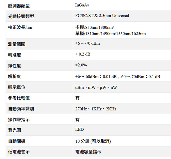 校正波長:多模:850nm/1300nm、單模:1310nm/1490nm/1550nm/1625nm、三種頻率供選擇(270Hz/1KHz/2KHz)、背光大LCD顯示面板、具有防震保護套及收納袋方便攜帶與存放、適用於光纜佈線與光路維護之驗收與檢測