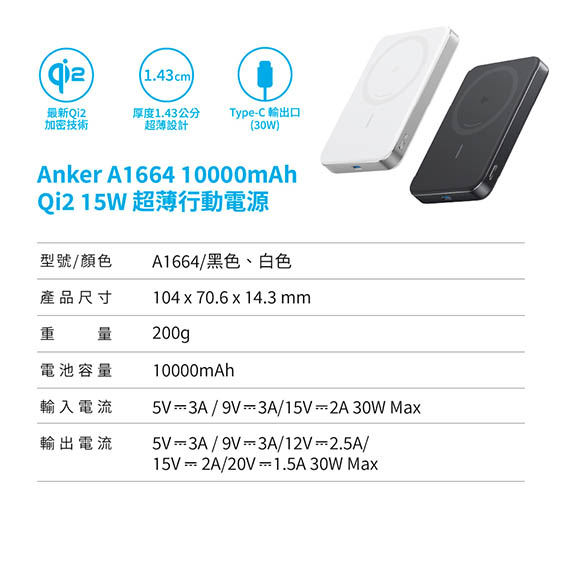 ANKER 10000mAh A1664 白 超薄磁吸行動電源