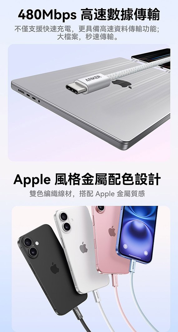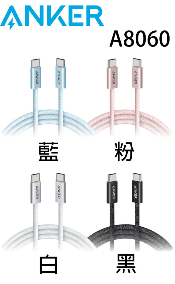 ANKER A8060 粉色 240W 編織 Type-C USB傳輸線 C公-C公 1M