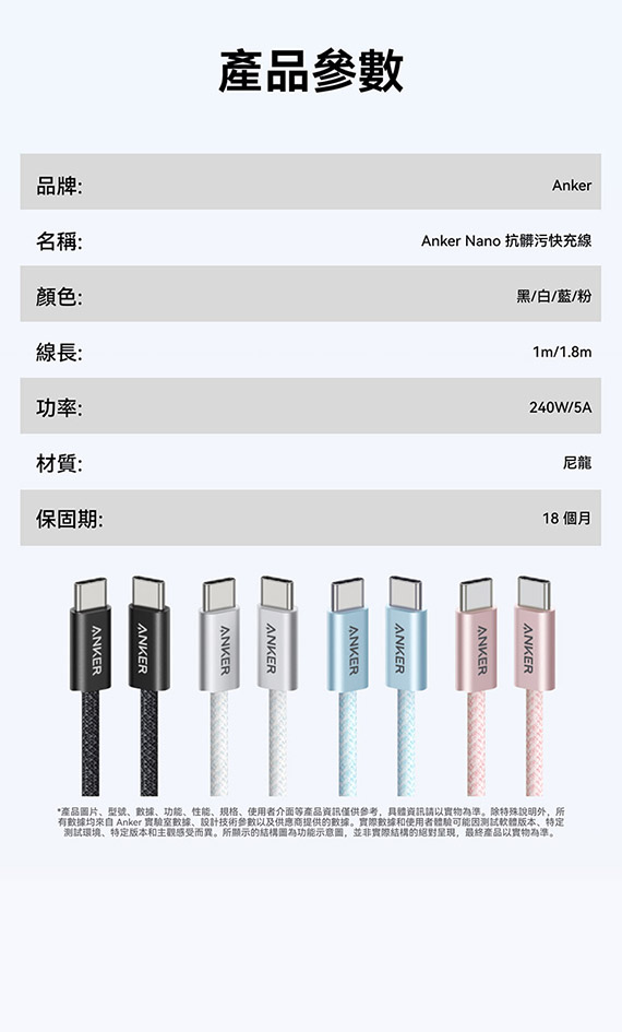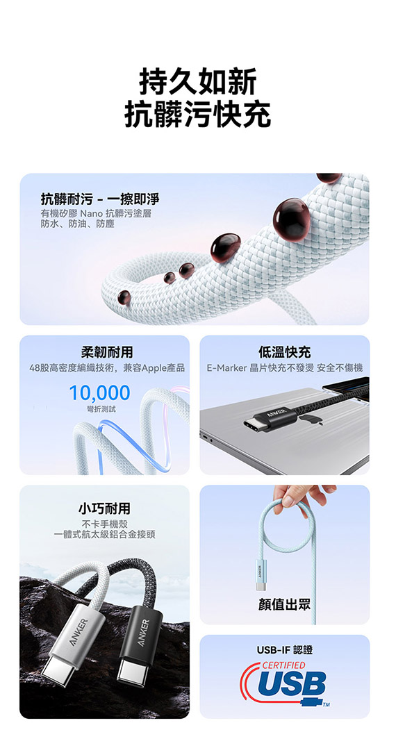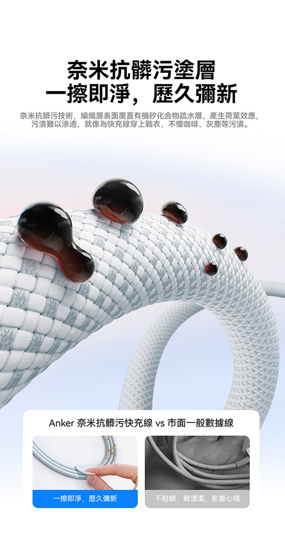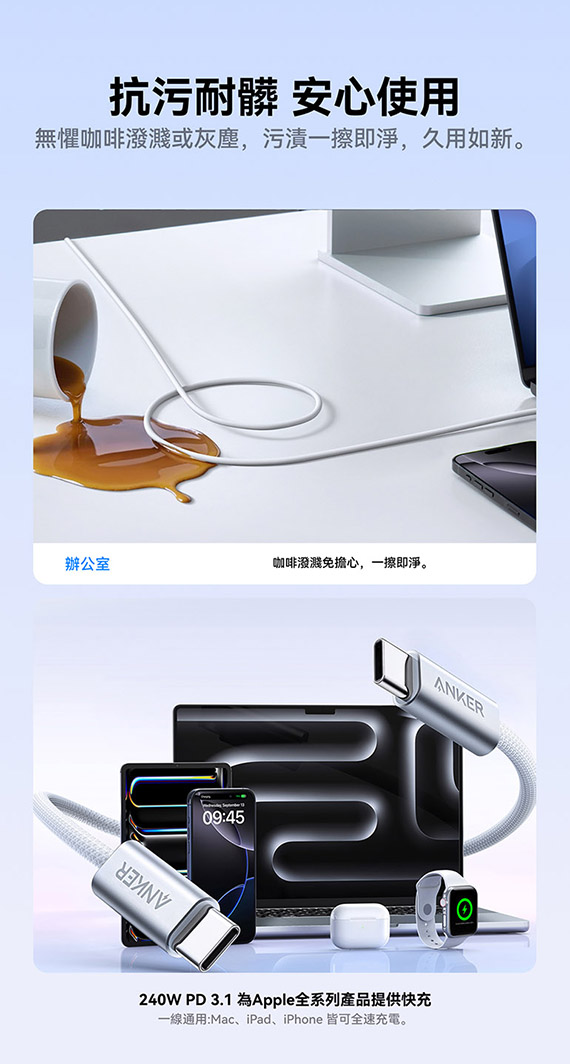 USB,C公--C公,線長:1公尺(1米)/100公分(100cm),支援240W高速充電,傳輸速度480Mbps,有機矽膠Nano抗髒污塗層、防水、防油、防塵,一擦即淨,48股密度編織技術,通過超過1萬次耐彎折測試