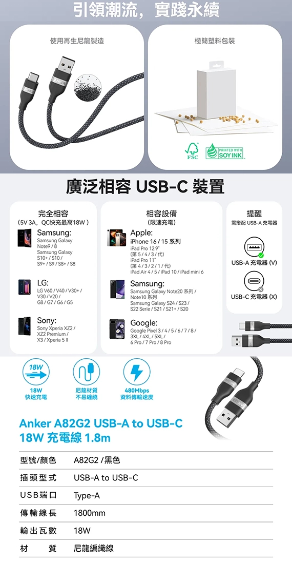USB,A公--C公,線長:1.8公尺(1.8米)/180公分(180cm),支援18W高速充電,傳輸速度480Mbps,再生尼龍編織材質,通過超過35000次耐彎折測試