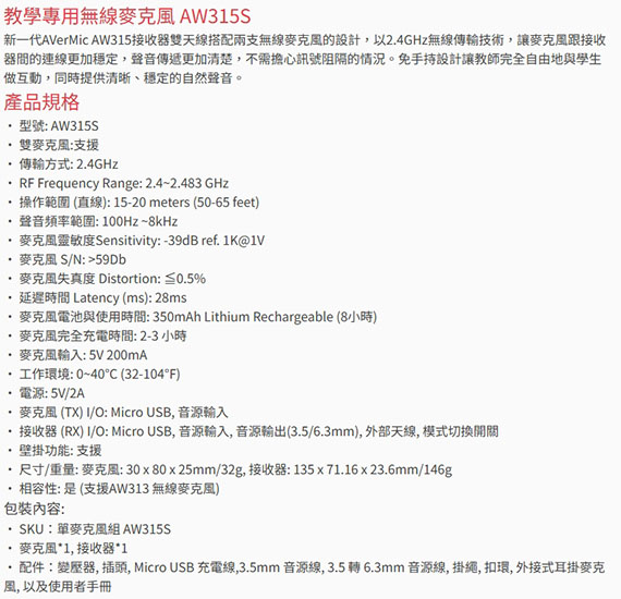 AverMedia圓剛 AW315F 2.4GHz 無線教學雙麥克風+充電組AW315C 組合(促銷價至 12/31 止)