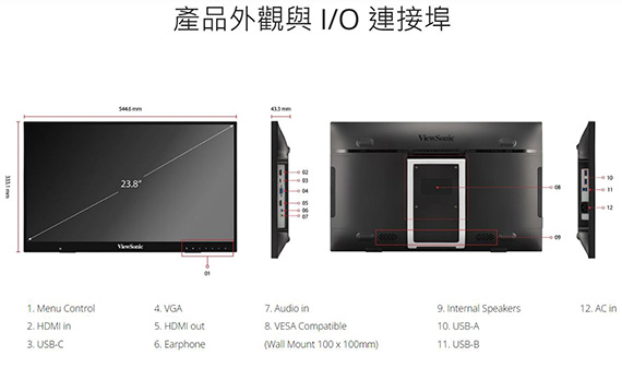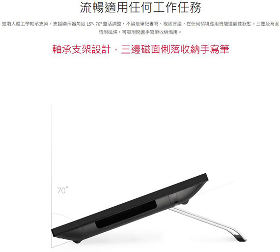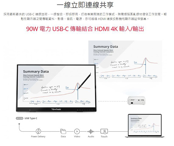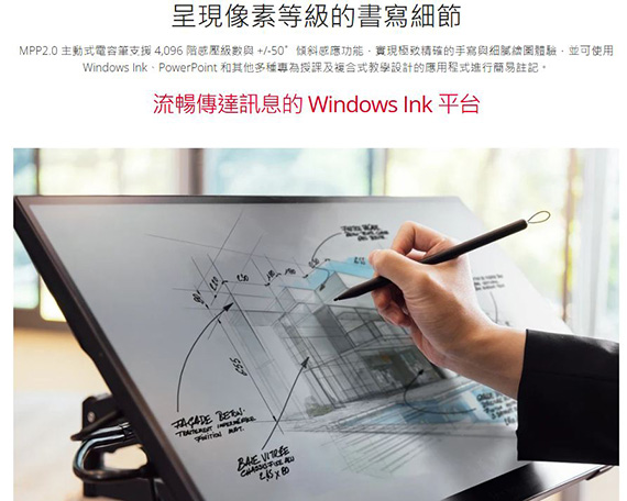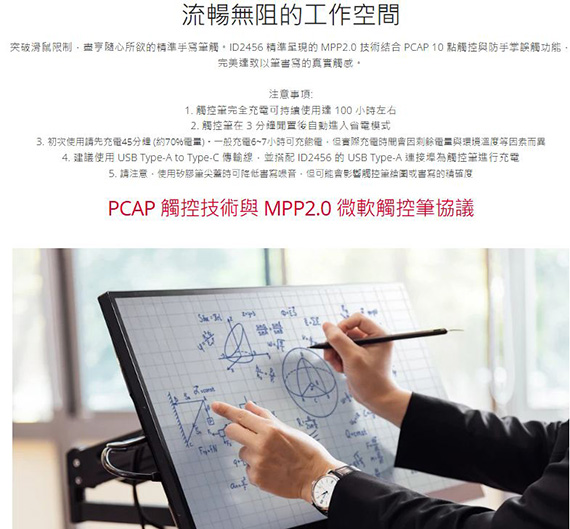 23.8吋、16:9寬螢幕、TFT LCD面板、解析度1920x1080(Full HD 1080P)、對比1000:1、亮度250cd/m2、輸入介面:USB-C*1、HDMI、VGA、支援HDCP、USB-A*2、USB-B*1、音訊孔、內建3W*2喇叭、採用PCAP觸控技術、搭載MPP2.0主動式電容筆、支援4096階感壓級數與+/-50傾斜感應功能、貼心人體工學設計、延伸Windows Ink數位書寫與設計工作空間、可相容所有支援 Microsoft Pen Protocol的裝置、簡報/會議和教學最佳解決方案