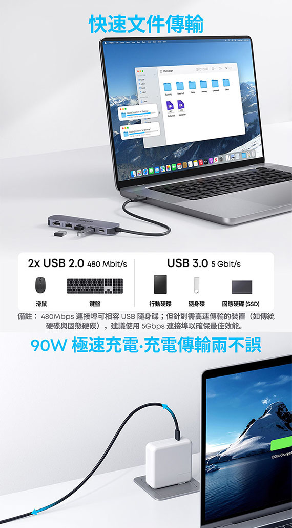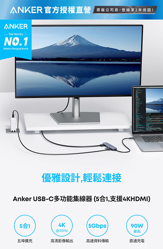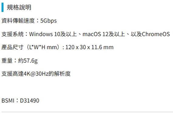 Type-C介面,提供擴充:USB-A 2.0*2,USB-A 3.0*1,HDMI*1(4K),PD-in 90W Max.*1,USB3.0傳送速率高達5Gbps,USB2.0傳送速率高達480Gbps,90W直通電源充電, 多功能5合1設計,優雅設計、輕鬆連接,一年保固 BSMI認證碼: D31490