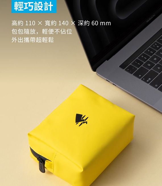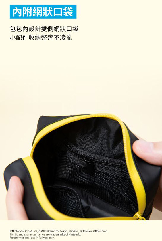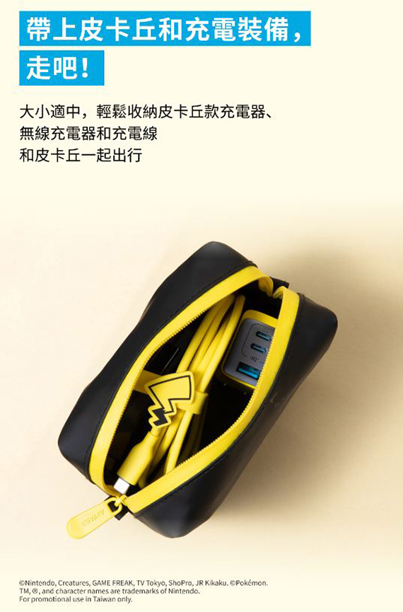 透氣網布、零壓收納隨身小物,包身印皮卡丘剪影,輕鬆收納皮卡丘款充電器、無線充電器、充電線,內附網狀口袋、收納整齊,尺寸:11×14×6cm