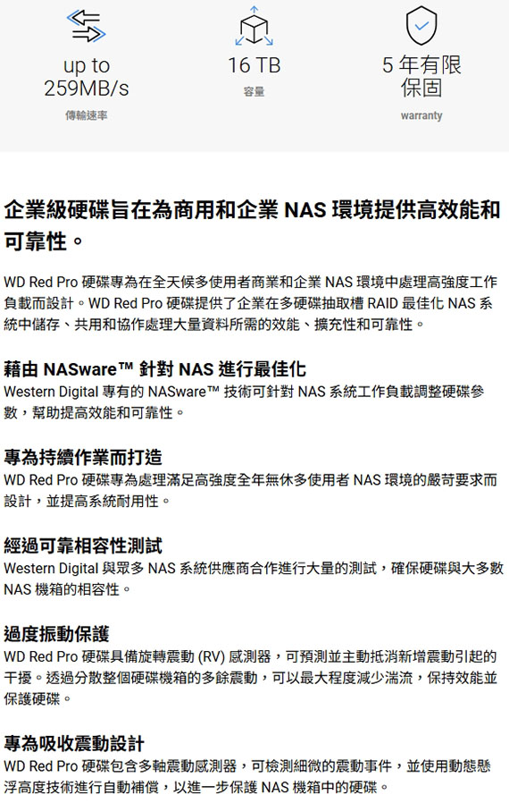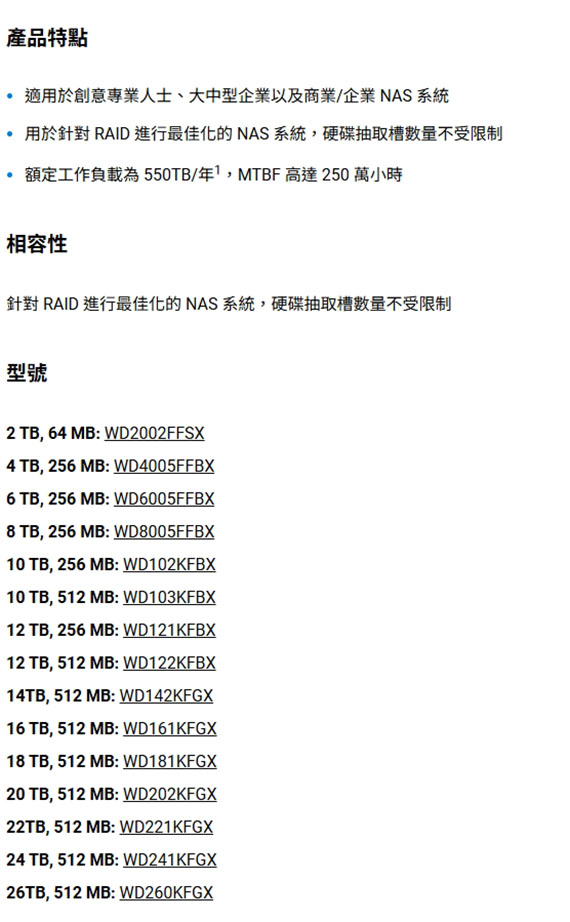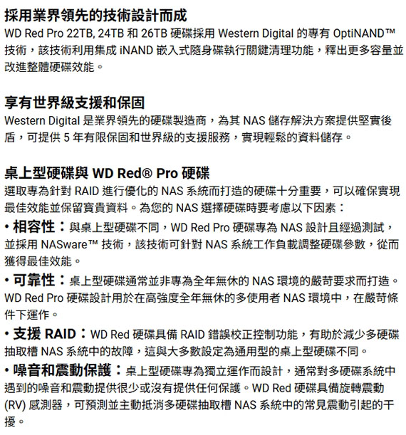 SATA,轉速:7200RPM,512MB快取記憶體,傳輸速率217MB/s,3.5吋,為吸收震動設計,支援RAID,專為在全天候多使用者商業和企業NAS環境中處理高強度工作負載而設計,5 年有限保固