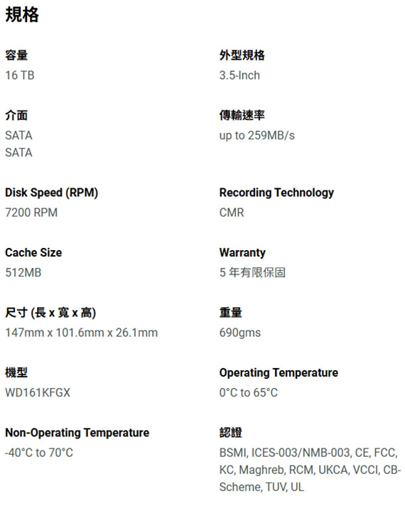 Western Digital威騰 16TB WD161KFGX 紅標PRO NAS專用硬碟 (五年保固) (客訂)