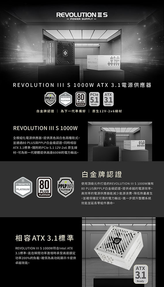 ENERMAX保銳 1000W 金靜冰核系列 REVOLUTION III S 黑 80PLUS白金牌 全模組化 ATX3.1 PCIe5.1 電源供應器 全日系電容 (ERV1000P-AHP)