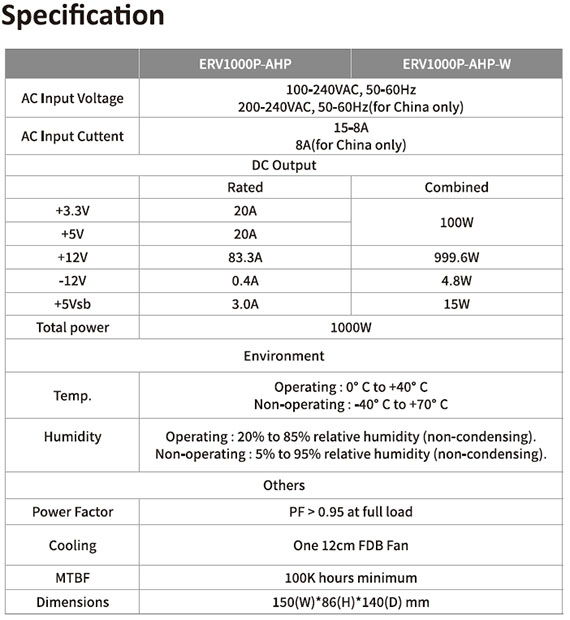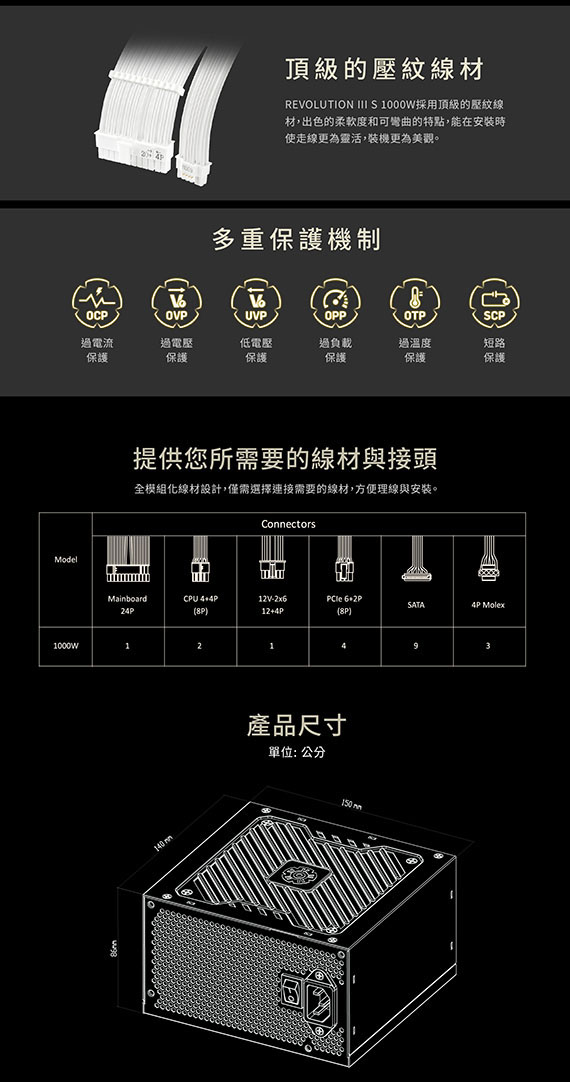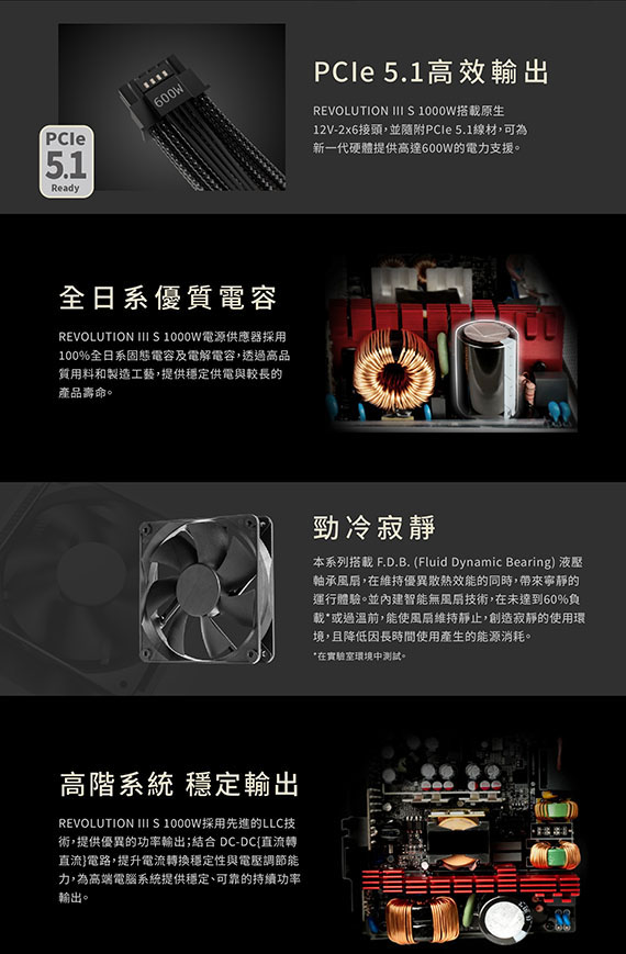 1000W,80PLUS白金牌,單組+12V,靜音120mm FDB風扇,線材接頭:Motherboard 24 pin*1、CPU 4+4 pin*2、12V-2x6 12+4 pin*1、12V-2x6 to PCIe 6+2 pin (2 connectors)*1、PCIe 6+2 pin*2、SATA (3 connectors) + 4P Molex (1 connector),全日系固態電解電容,13年保固