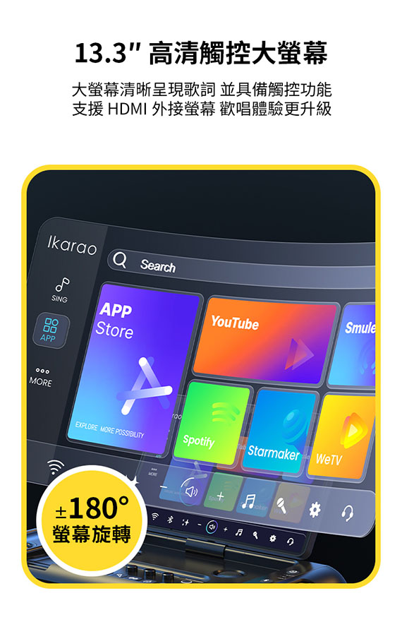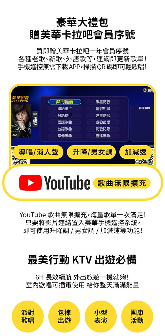行動KTV一機完美整合螢幕x喇叭x無線麥克風,藍牙5.4,驅動單元:2.6吋高音*2+6.5吋低音,功率:100W(RMS)/460W(峰值),13.3吋觸控螢幕(可外接電視/投影機),6hr長效續航+20H超強續航麥克風,美華卡拉霸自動更新歌曲,沉浸式互動燈效,I/O介面:6.5mm/AUX/USB/Micro SD/HDMI,重量11.8Kg,附無線麥克風*2,NCC:CCAP24LP3960T6,CCAP24LP3430T3