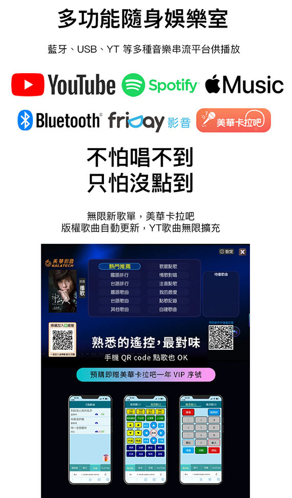 行動KTV一機完美整合螢幕x喇叭x無線麥克風,藍牙5.4,驅動單元:4吋全音域*1,功率:12W(RMS)/80W(峰值),7吋觸控螢幕(可外接電視/投影機),5hr長效續航+6H超強續航麥克風,美華卡拉霸自動更新歌曲,開機連網即更新/YT歌曲任你點,聲效模式一鍵切換(8種音效),I/O介面:3.5mm/AUX/USB/Type-C,重量1.8Kg,附無線麥克風*2,NCC:CCAP24LP3960T6, CCAP25LP1350T3 BSMI認證碼: R3B489