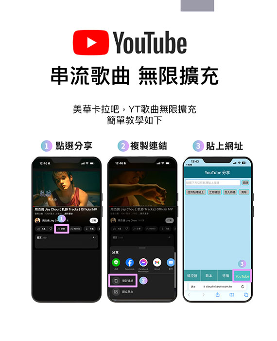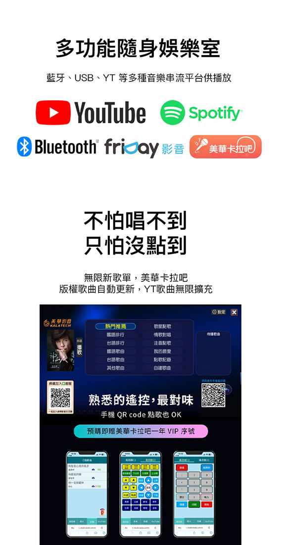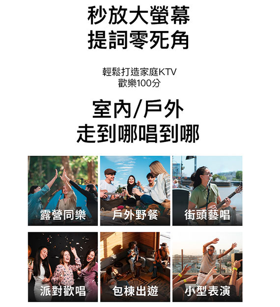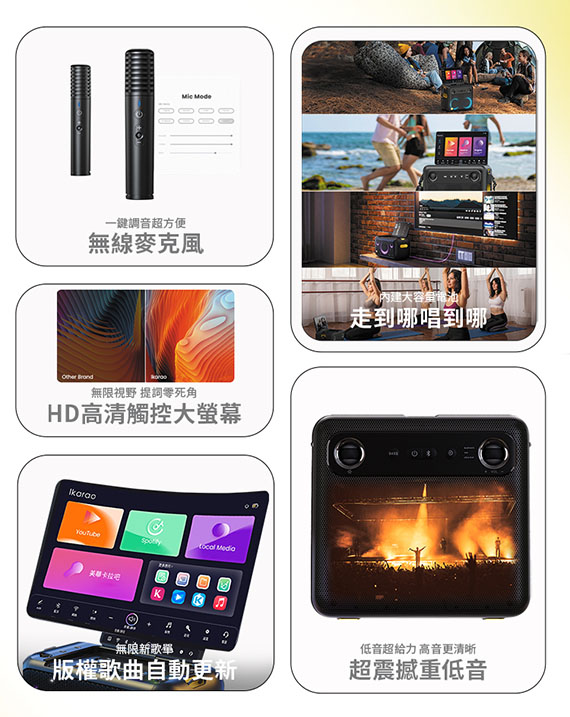行動KTV一機完美整合螢幕x喇叭x無線麥克風,藍牙5.4,驅動單元:1.2吋高音*2+4吋低音*2,功率:70W(RMS)/300W(峰值),10.1吋觸控螢幕(可外接電視/投影機),8hr長效續航+20H超強續航麥克風,美華卡拉霸自動更新歌曲,沉浸式互動燈效,I/O介面:6.5mm/AUX/USB/Micro SD/HDMI,重量6.8Kg,附無線麥克風*2,NCC:CCAP24LP3440T6,CCAP24LP3430T3
