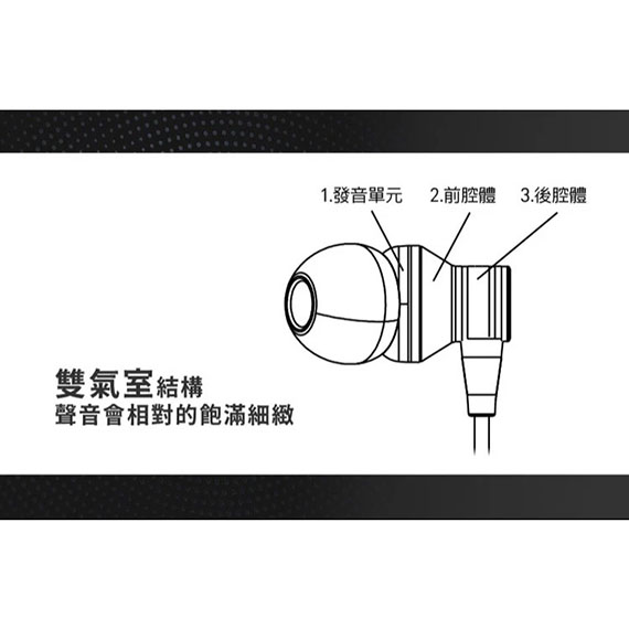 入耳式(耳道),10mm薄膜式單體喇叭,雙氣室專利結構設計,利用聲音在氣室中震盪輸出至人體聲音會相對的飽滿細緻,TYPE-C音源轉接線,斜切式人體功學設計,專業進口網目數的濾音網,三環四節鍍金插針接頭,保固一年 BSMI認證碼: R3A141