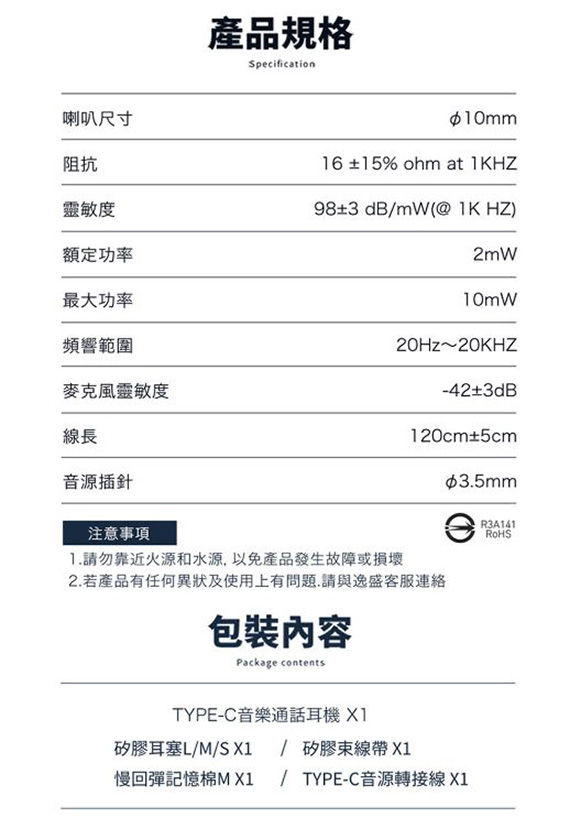 入耳式(耳道),10mm驅動單元,附贈慢回彈記憶棉、TYPE-C音源轉接線,玩家級濾音網,全鋁合金氧化電鍍處理,玩家級線材,全指向高感度麥克風,保固一年 BSMI認證碼: R3A141
