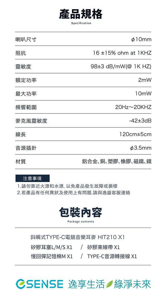 入耳式(耳道),10mm驅動單元,附贈慢回彈記憶棉、TYPE-C音源轉接線,斜角入耳式耳機設計,玩家級扭紋線線材,鍍金插針接頭,全指向高感度麥克風,保固一年 BSMI認證碼: R3A141