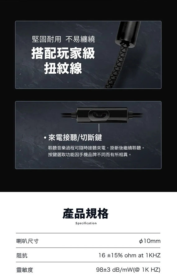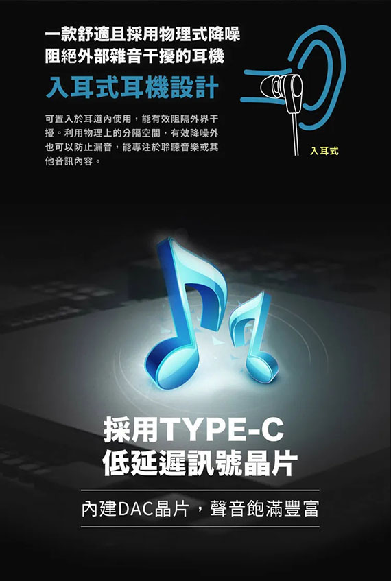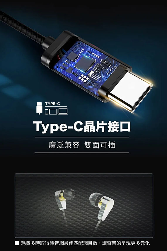 入耳式(耳道),10mm驅動單元,TYPE-C內建音頻解碼晶片,濾音網最佳匹配網目數,符合美、中、韓三國Android線控耳機協議標準,玩家級扭紋線,高感度麥克風,保固一年 BSMI認證碼: R3A141