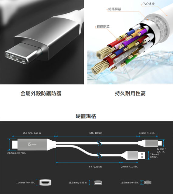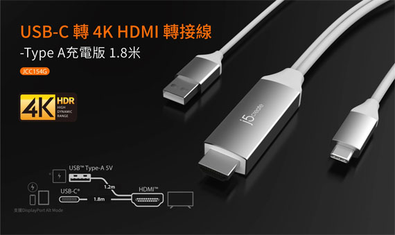 j5 create JCC154G Type A充電版 USB Type-C公-HDMI A公 1.8M (客訂)