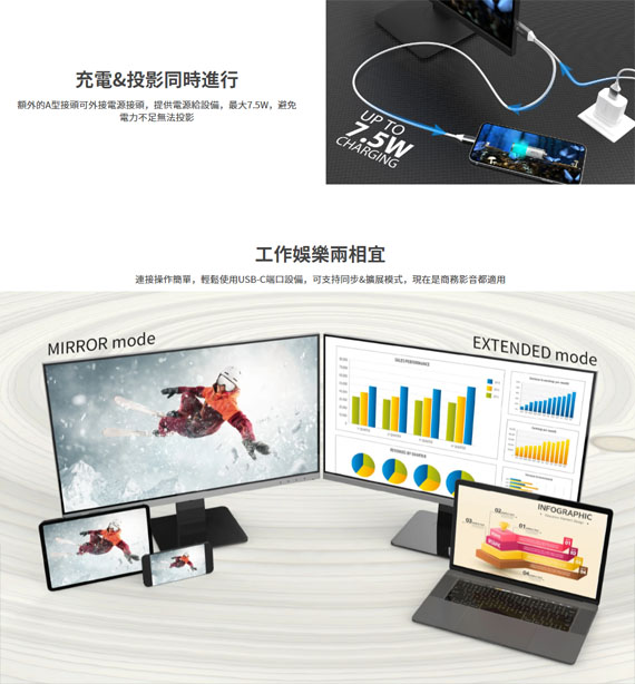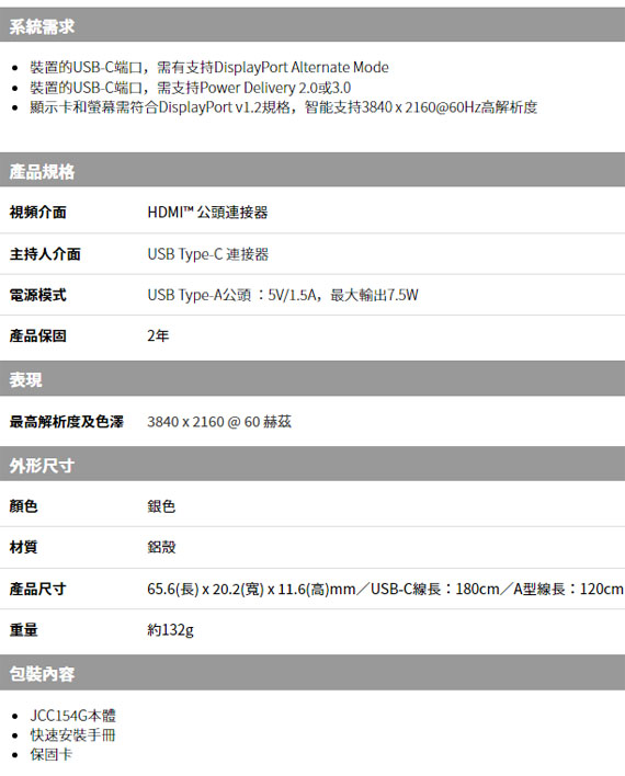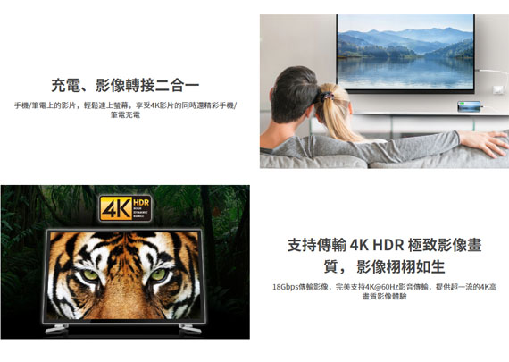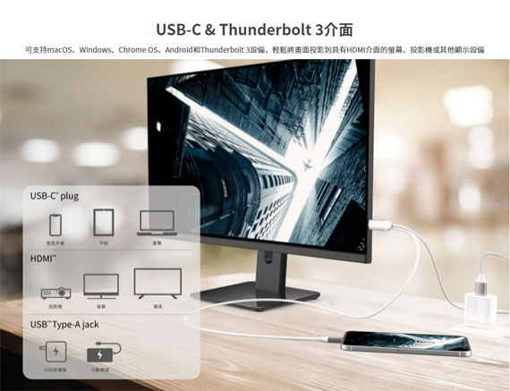 USB Type-C公<-->HDMI A公19pin,相容Thunderbolt 3介面,另附有A型接頭(公)可同時充電輸出7.5W,線長:1.8公尺(1.8米)/180公分(180cm),可將手機、組裝自製筆電的畫面,導入到帶有HDMI介面的螢幕、投影機或其他顯示設備,高畫質4K 3840 x 2160@60Hz,充電、影像轉接二合一,充電&投影同時進行,2年保固