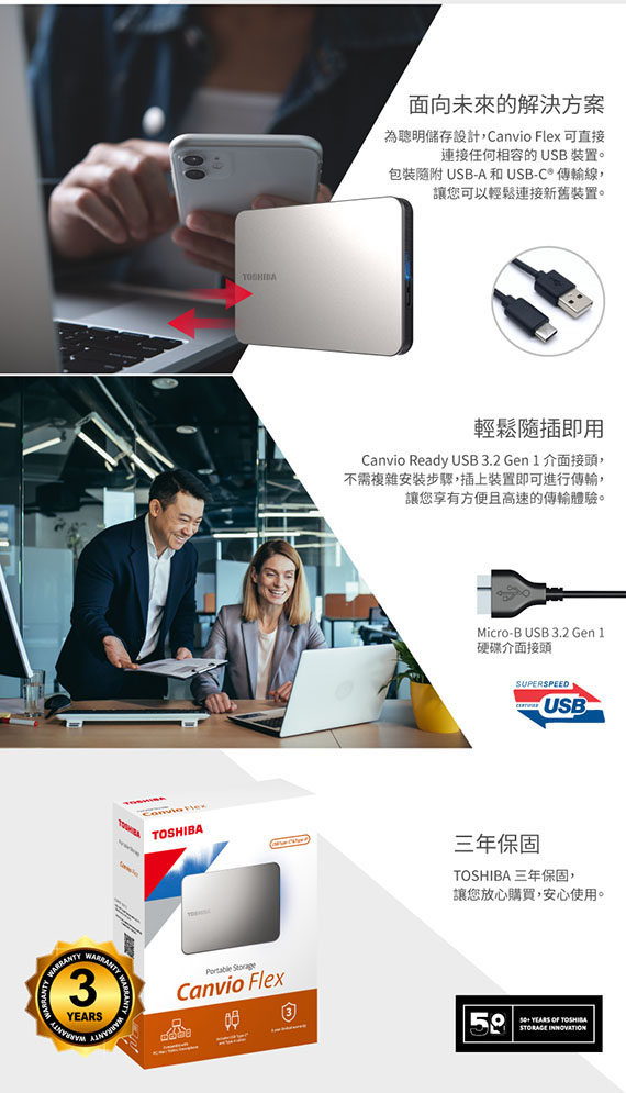 USB 3.2 Gen 1,USB-A/Type-C介面,最高速度5Gb/s,跨裝置連接,相容Mac、Windows PC 和平板電腦,附Type-A傳輸線和Type-C傳輸線,三年保固,,須保留貼於產品上之條碼與原廠產品序號,做為日後維修保固的憑證
