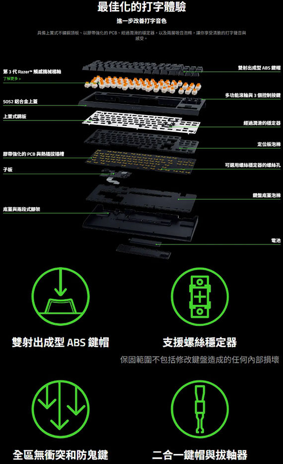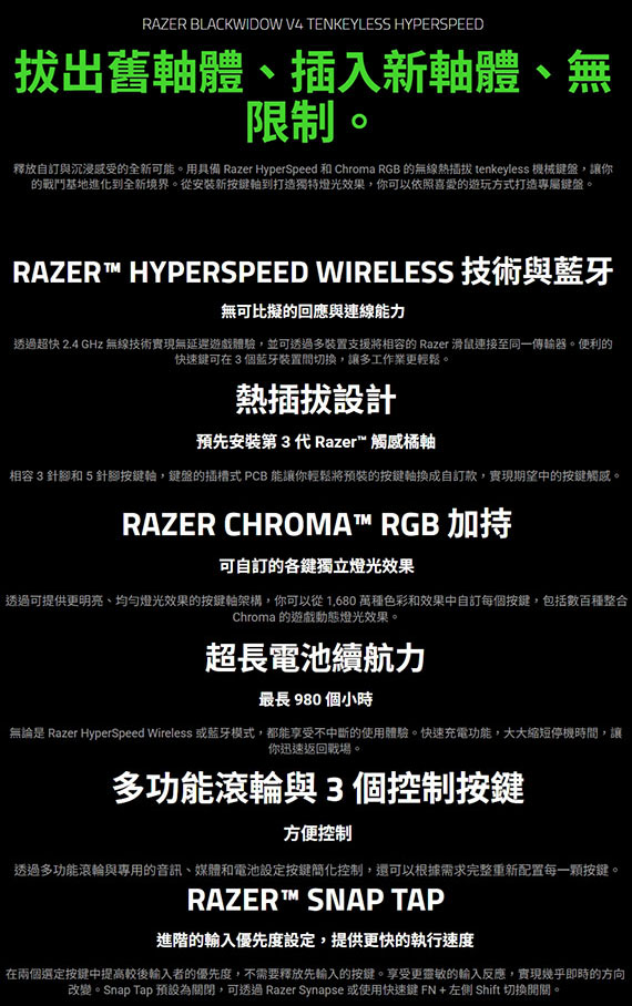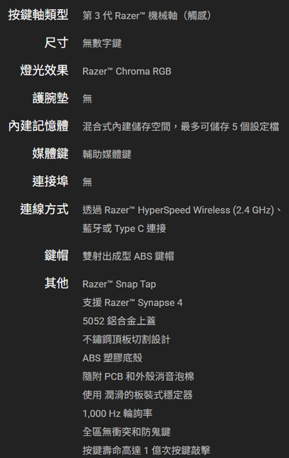 透過 Razer™ HyperSpeed Wireless(2.4 GHz)、藍牙或Type C連接,第3代Razer機械觸感橘軸,熱插拔設計,多功能滾輪與3個控制按鍵,二合一鍵帽與拔軸器,雙射出成型ABS鍵帽,最長980個小時電池續航,電池電量指示器與省電模式,可自訂的各鍵獨立燈光效果,支援螺絲穩定器,全區無衝突和防鬼鍵,2年保固 NCC認證碼: CCAH25LP4660T5 BSMI認證碼: R39212