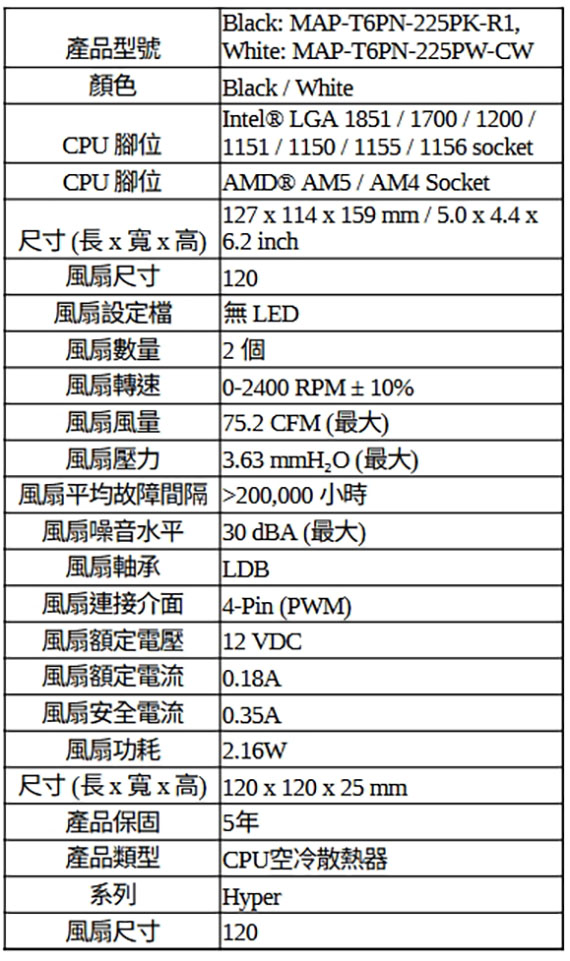 Intel:LGA 1851/1700/1200/1151/1150/1155/1156、AMD:AM5/AM4、風扇尺寸120x120x25mm、風量75.2CFM、轉速2400RPM±10%、噪音值30dBA、靜壓3.63mm-H2O、散熱器尺寸(含扇):127x114x159mm、4Pin PWM接頭、六熱管設計、內部設計的熱管、增強的視覺設計、可拆卸頂蓋、5年保固