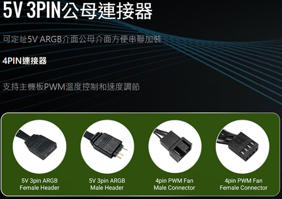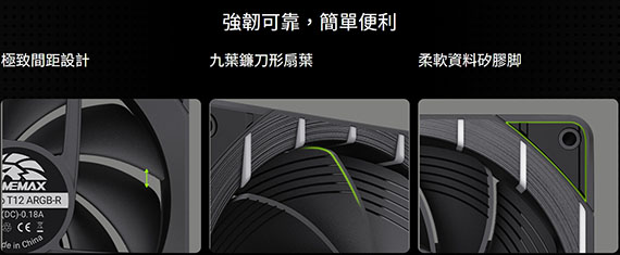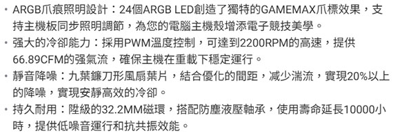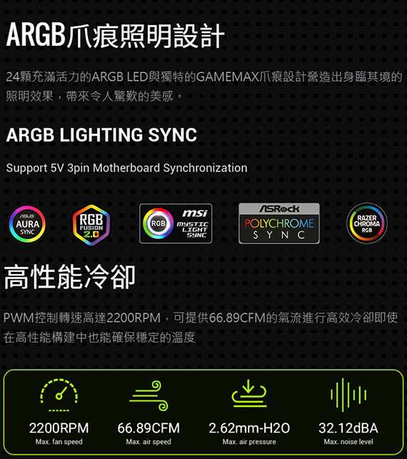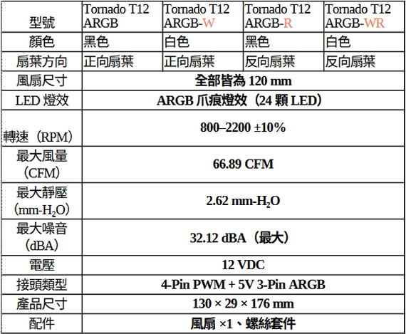 尺寸:130*29*176mm,風扇轉速800-2200轉/分鐘±10%,最大風量66.89 CFM,最大靜壓2.62mm-H2O,最大噪音值32.12分貝(A),9片反向扇葉,ARGB爪痕照明設計外環24顆LED,液壓軸承,PWM溫度控制(Tornado T12 ARGB-RW)