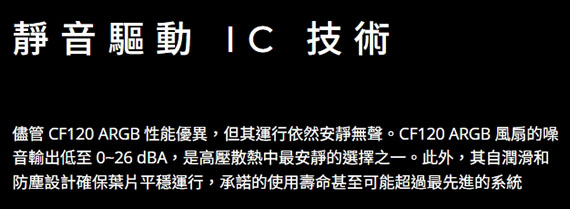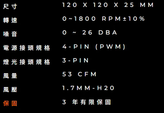 尺寸:120*120*25mm,轉速0-1800RPM±10%,噪音0-26DBA,風量53CFM,風壓1.7MM-H2O,環形一體式效能葉片設計,靜音驅動IC技術,3年保固