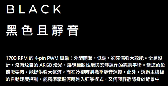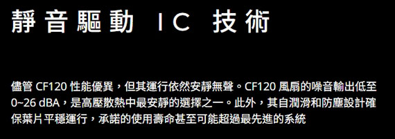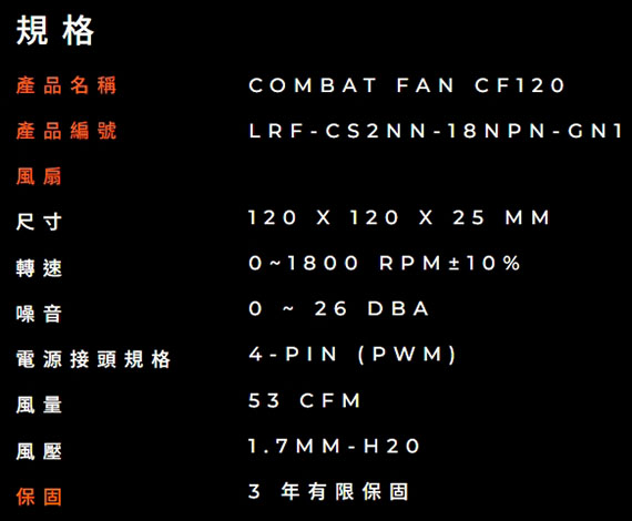 尺寸:120*120*25mm,轉速0-1800RPM±10%,噪音0-26DBA,風量53CFM,風壓1.7MM-H2O,環形一體式效能葉片設計,靜音驅動IC技術,3年保固