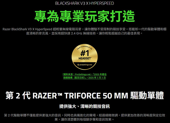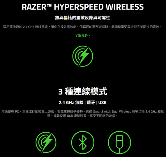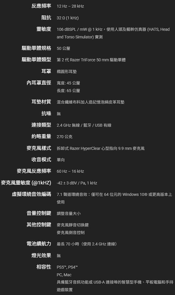 耳戴/耳罩式/護耳式/全罩,第2代Razer TriForce 50 mm驅動單體,2.4 GHz無線/藍牙/USB有線,電池續航力最長70小時,拆卸式Razer HyperClear型指向9.9mm麥克風,混合纖維布料加人造記憶泡綿皮革耳墊, NCC認證碼: CCAH25LP2850T0 BSMI認證碼: R39212